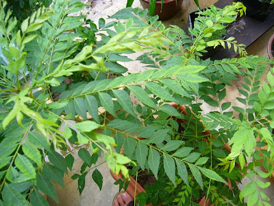 In another book about herbs that I read recently, there's a mentioned about using the leaves traditionally for promoting shiny, black hair. A bundle of the Sweet Neem leaves are washed & dried. The dried leaves are then grind to a powdery form and by mixing a teaspoonful of this dried powdered leaves to a glass of water, drink as tea everyday for at least a continuous of 48 days...will actually encourage the growth of one's hair to be black & shiny. I guess, I should seriously consider trying this method real soon....bye,bye grey hair!!